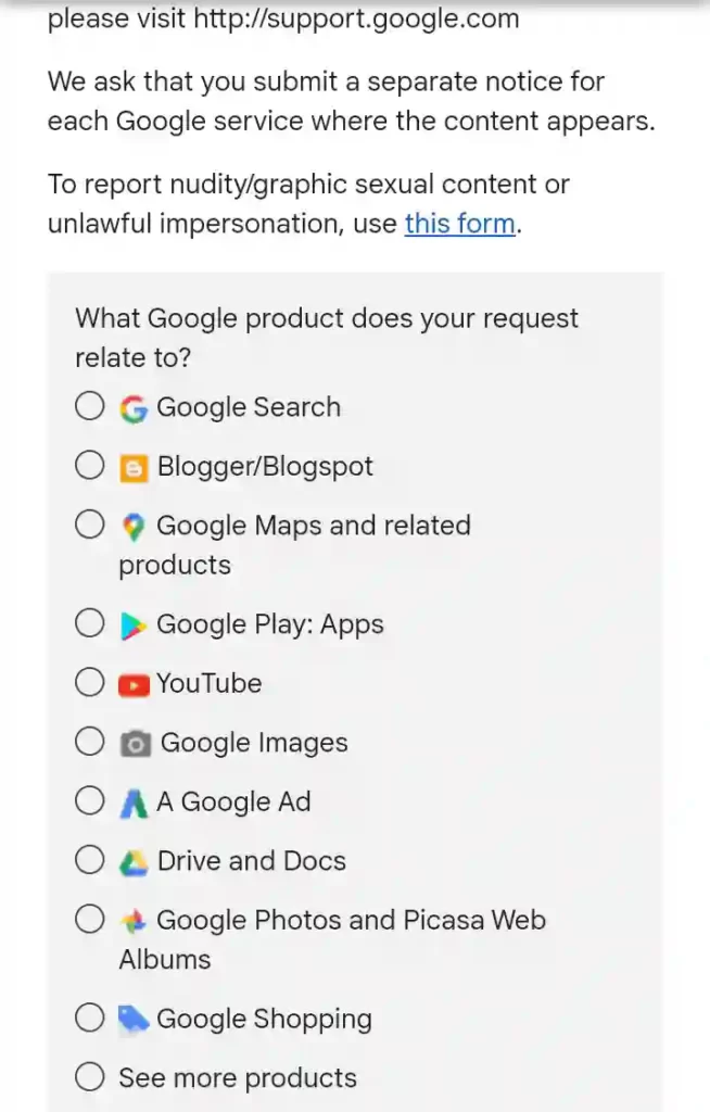 किसी ब्लॉग के खिलाफ क्लेम करने के लिए सबसे पहले आपको “Removing Content From Google” वेबसाइट पर जाना है जिसको आप गूगल में सर्च कर सकते है या फिर इस लिंक पर कि्लक Removing Content From Google इस वेबसाइट पर जा सकते है जहाँ आपको कुछ ऐसा ऑप्शन देखने को मिलता है।