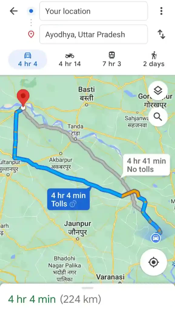 इसी तरह आप अगल – अलग स्थानो के नाम यहाँ गूगल मैप में सर्च करके उसकी दूरी जान सकते है उदारहण के लिए मैने उसी तरह फिर से सर्च किया है Ayodhya kitne kilometre hai तो आ यह रिजल्ट देख पा रहे है।