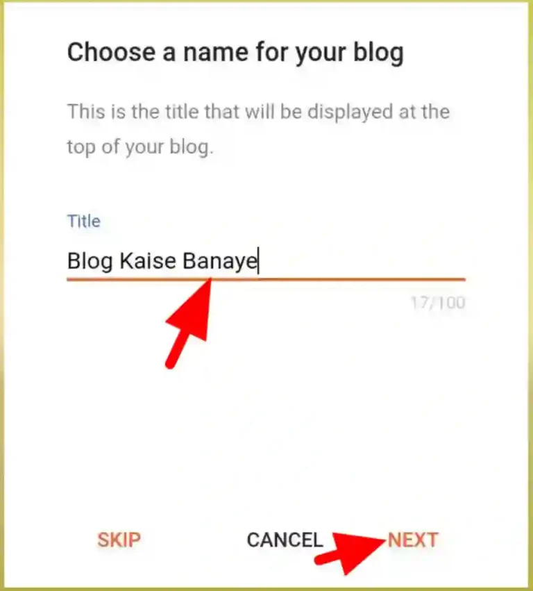 अब अगले स्टेप में आपको अपने ब्लॉग का Title नाम देना है आप जो भी अपने ब्लॉग का नाम रखना चाहते है वो लिख सकते है जैसे मैने लिखा “Blog Kaise Banaye” आप जो चाहे दे सकते हैं।