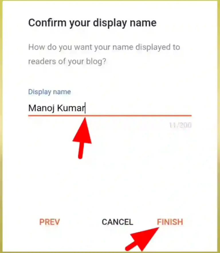 इसी तरह अगले पेज पर आपको अपना नाम देना है यह ब्लॉग के ऑर्थर का नाम होता है जो सभी पोस्ट में यह नाम दिखाई देता है तो आप जो नाम यहां देना चाहते है वह नाम यहाँ डाले और “Finish” पर कि्लक करे।