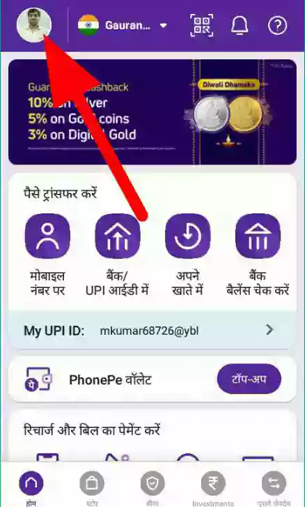 सबसे पहले अपने फोन पे एकाउंट को Open करे जहाँ आपको इस तरह के ऑप्शन देखने को मिलते है जैसा आप चित्र में देख पा रहे है।